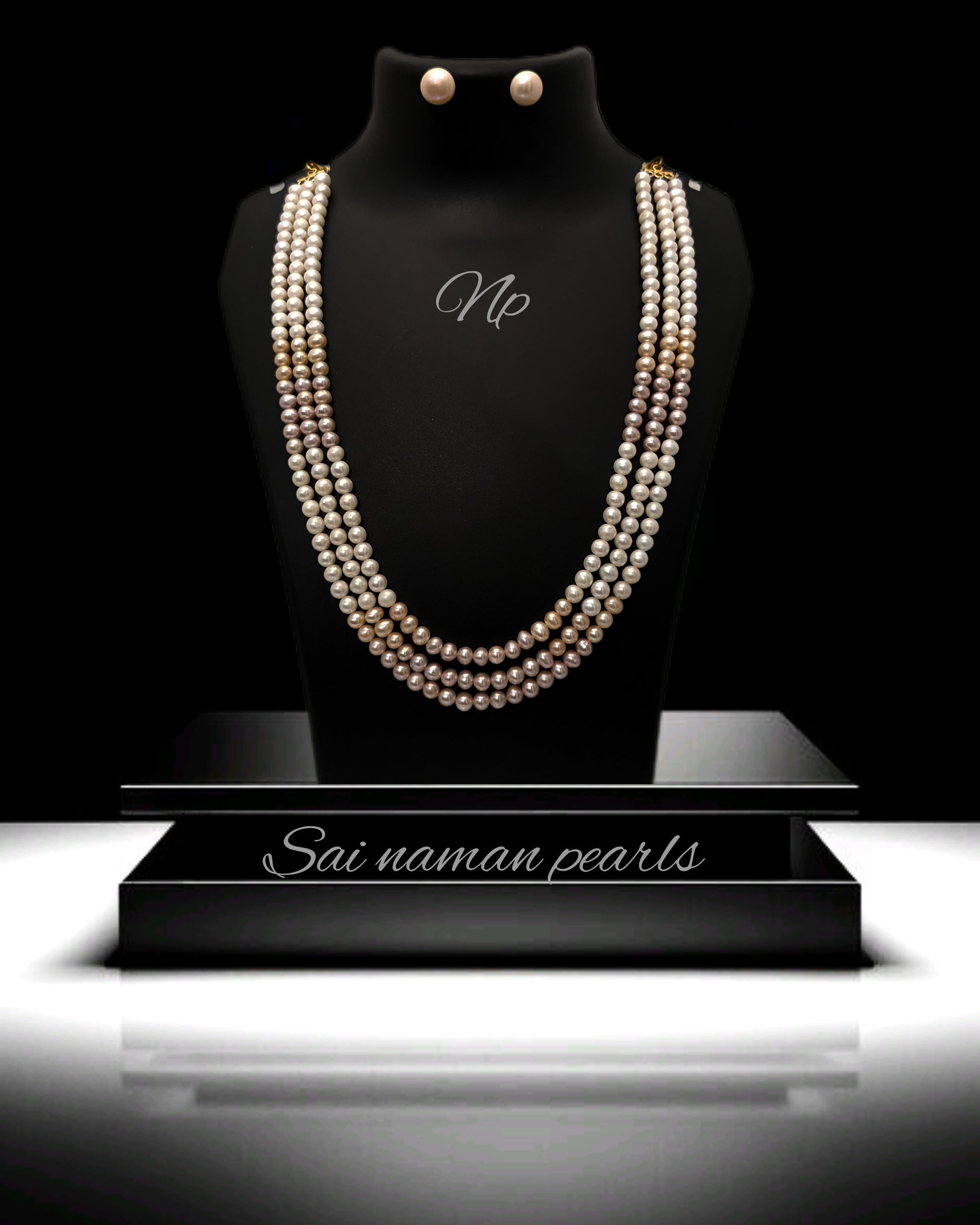 A mala necklace made with 3 lines of flat, colorful pearls. Enhance your meditation practice and embrace holistic wellness with this beautiful piece.