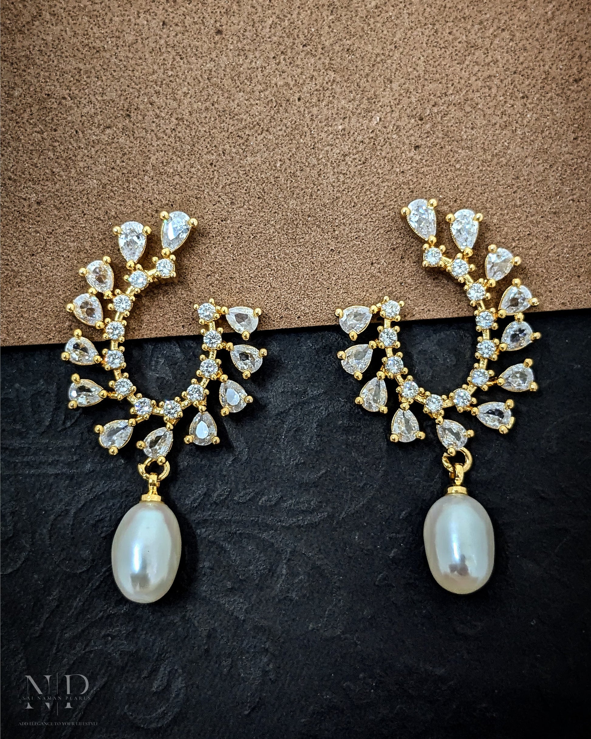 ROYAL REAL PEARLS EARRINGS WITH CZ WORK.